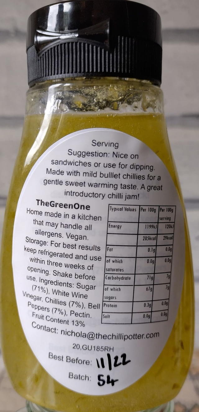 The Green One is a jam with a mild kick. Squeeze it out onto your sandwich or use for dipping. We wont judge.